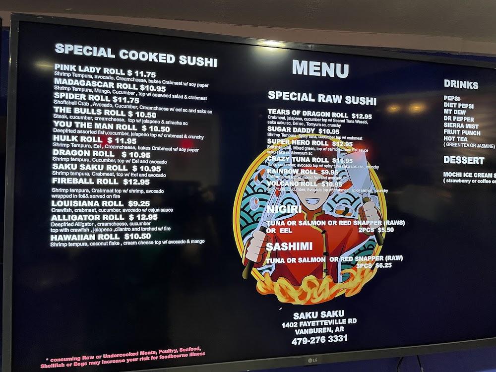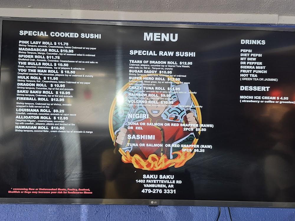 Welcome to Saku Saku Hibachi Grill, your go-to destination for an authentic Japanese dining experience in Van Buren, AR. Located at 1402 Fayetteville Rd, we serve delicious sushi and traditional hibachi dishes, perfect for lunch, dinner, or a quick meal on the go. Enjoy our cozy and relaxed atmosphere, whether dining solo or with a group. We offer convenient services like contactless delivery, takeout, and sit-down meals, all while catering to vegetarians and health-conscious diners. With wheelchair accessibility and ample parking, Saku Saku Hibachi Grill is perfect for everyone. Come savor our local specialties today!